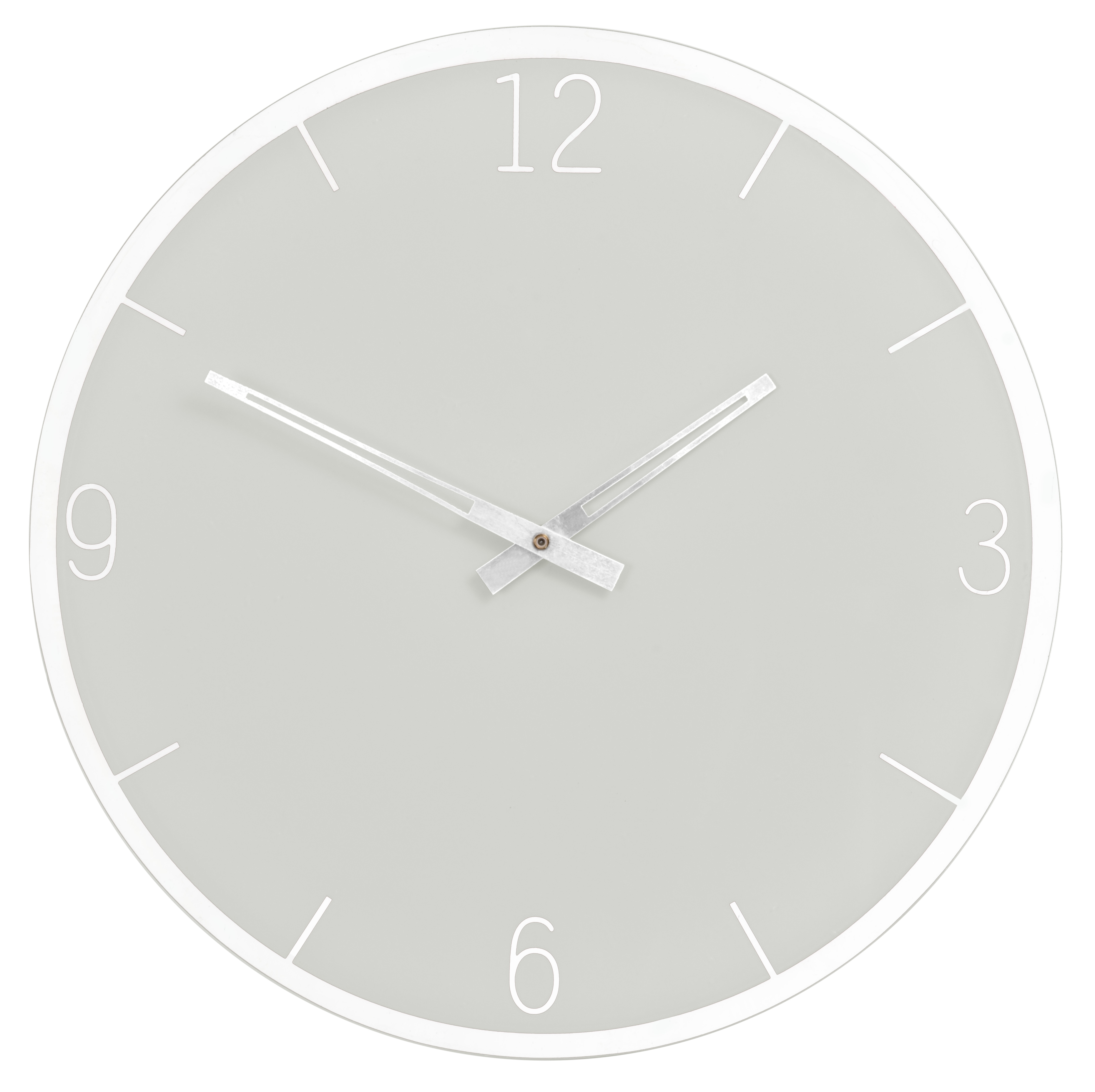 Часы настенные, стеклянные с зеркальной окантовкой. Кварцевый механизм с плавным ходом. Батарейки в комплект не входят. Диаметр 35 см. Цвет серый.