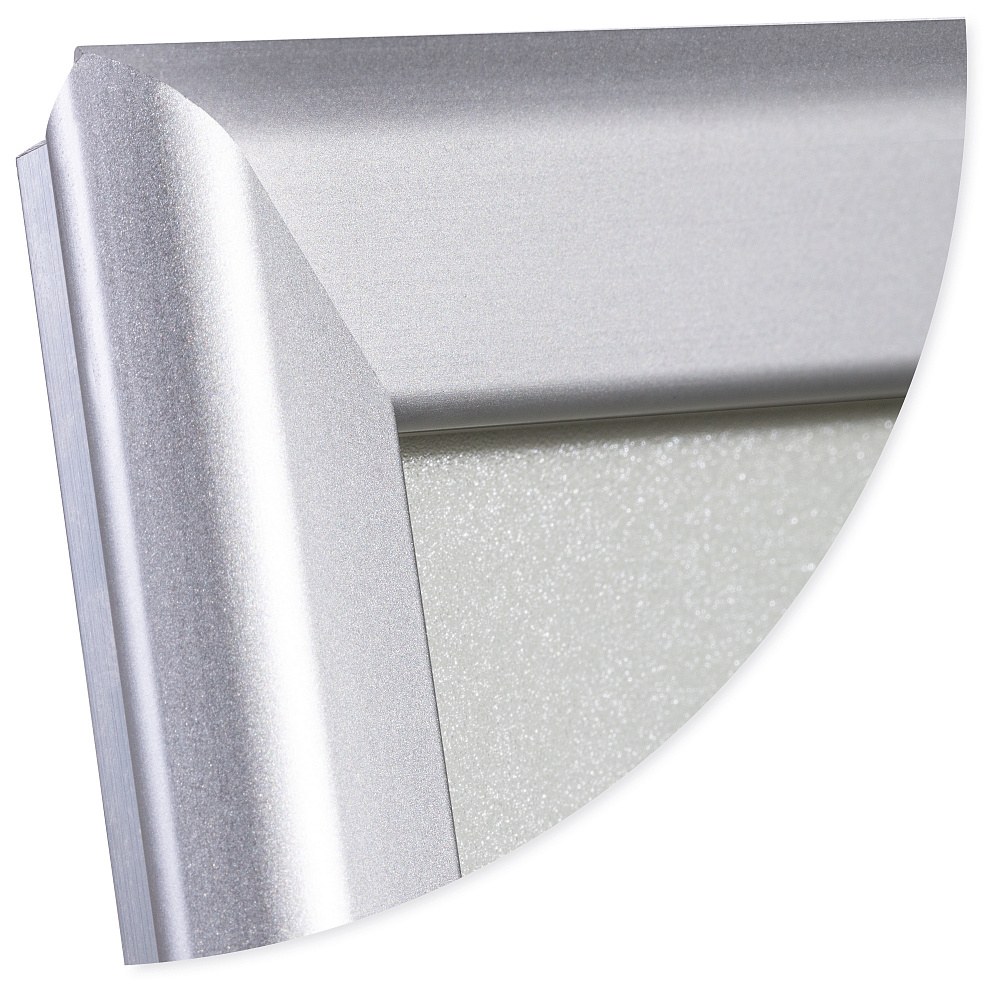 В алюминиевых рамах в качестве защитной вставки используется антибликовый матовый пластик ПЭТ, а не минеральное стекло. Рамка получается легкой и безопасной - её невозможно разбить даже намеренно.