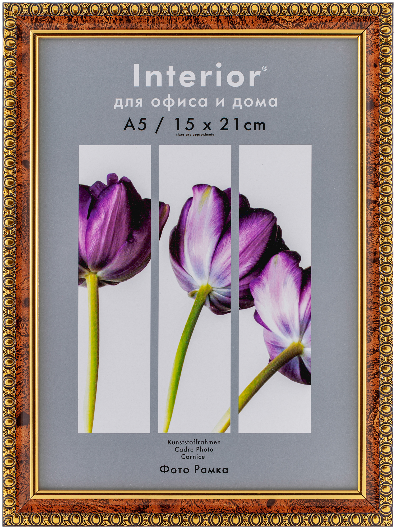 Коричневая рамка 15x21 (А5) из полукруглого багета шириной 15 мм с декоративными золотыми окантовками по внешнему и внутреннему периметру.