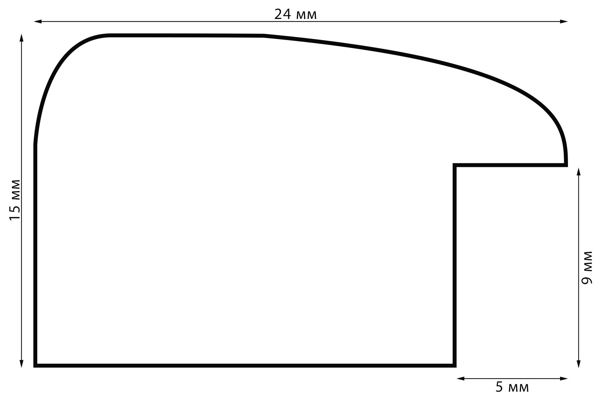 Толщина профиля 15 мм, ширина 24 мм. Внутренняя глубина профиля 9 мм, толщина задника 1 мм, защитной вставки из пластика ПЭТ 0,5 мм.
