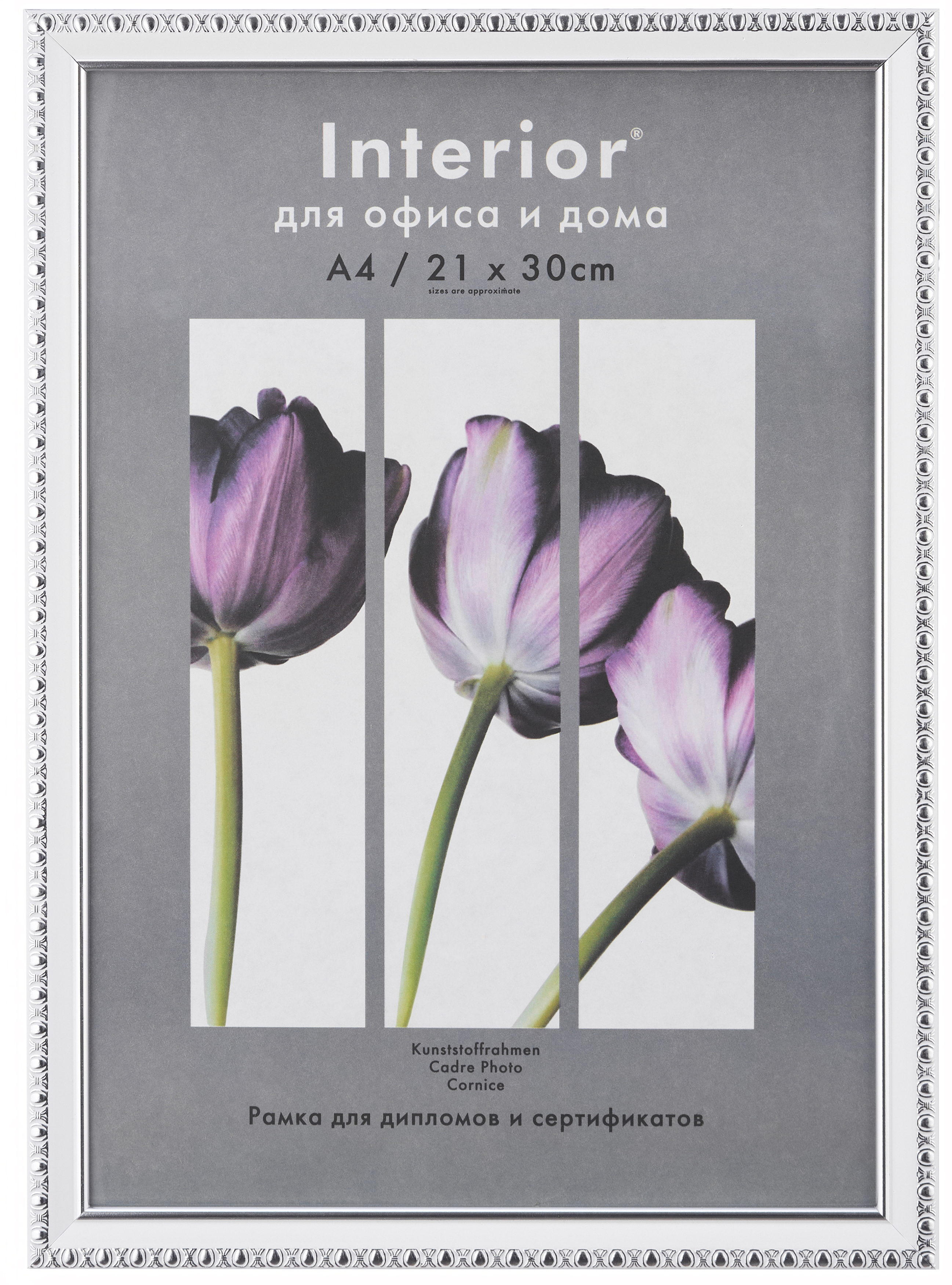 Белая рамка 21x30 (A4) из полукруглого багета шириной 15 мм с декоративными серебряными окантовками по внешнему и внутреннему периметру.