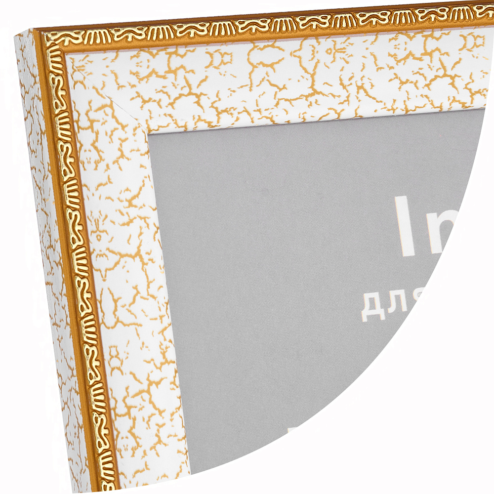 Белая рамка 21x30 (A4) из полукруглого багета шириной 25 мм с золотой вязью и золотым кантом по внешнему периметру.