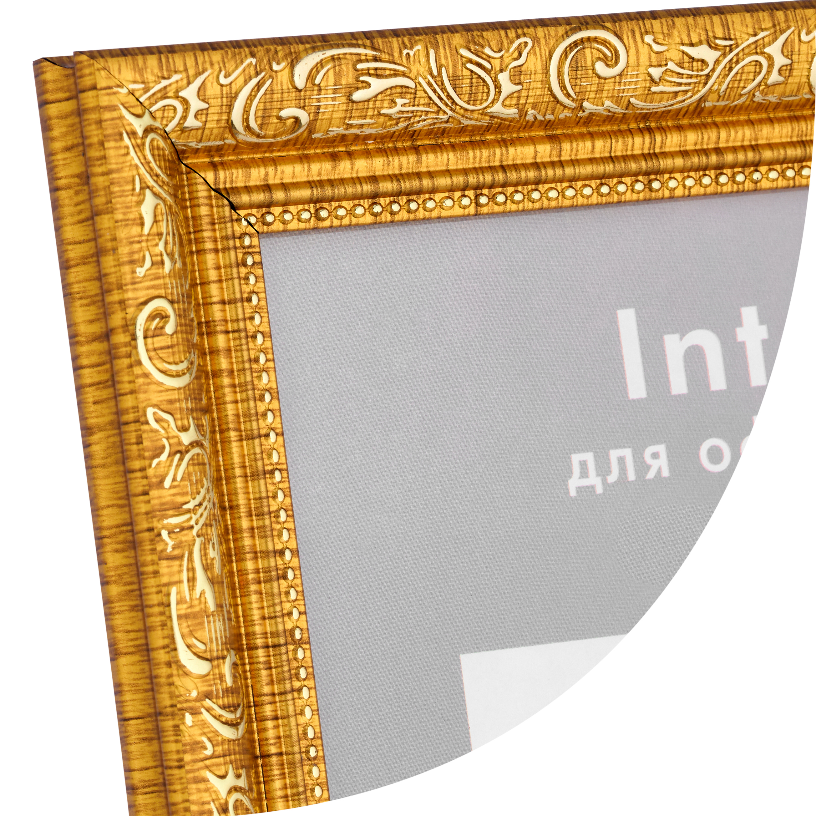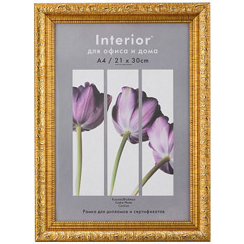 Золотая рамка 21x30 (A4) из округлого багета формы волны шириной 30 мм с широкой золотой вязью и двойным золотым кантом по внутреннему периметру.