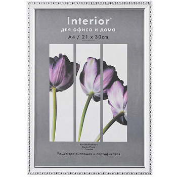 Белая рамка 21x30 (A4) из полукруглого багета шириной 15 мм с декоративными серебряными окантовками по внешнему и внутреннему периметру.