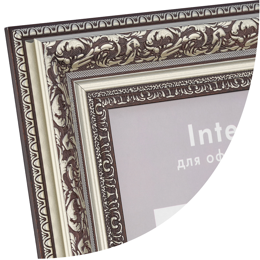 Черная рамка 50x70 из округлого багета формы волны шириной 60 мм с широкой серебряной вязью и серебряным кантом по внутреннему и внешнему периметру.