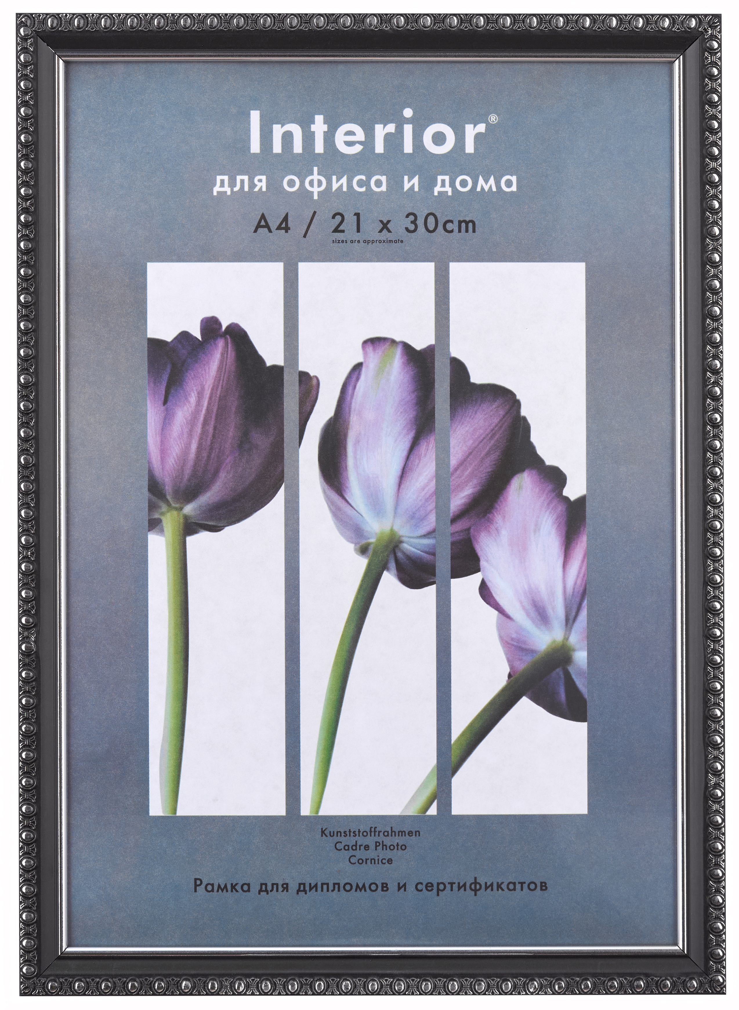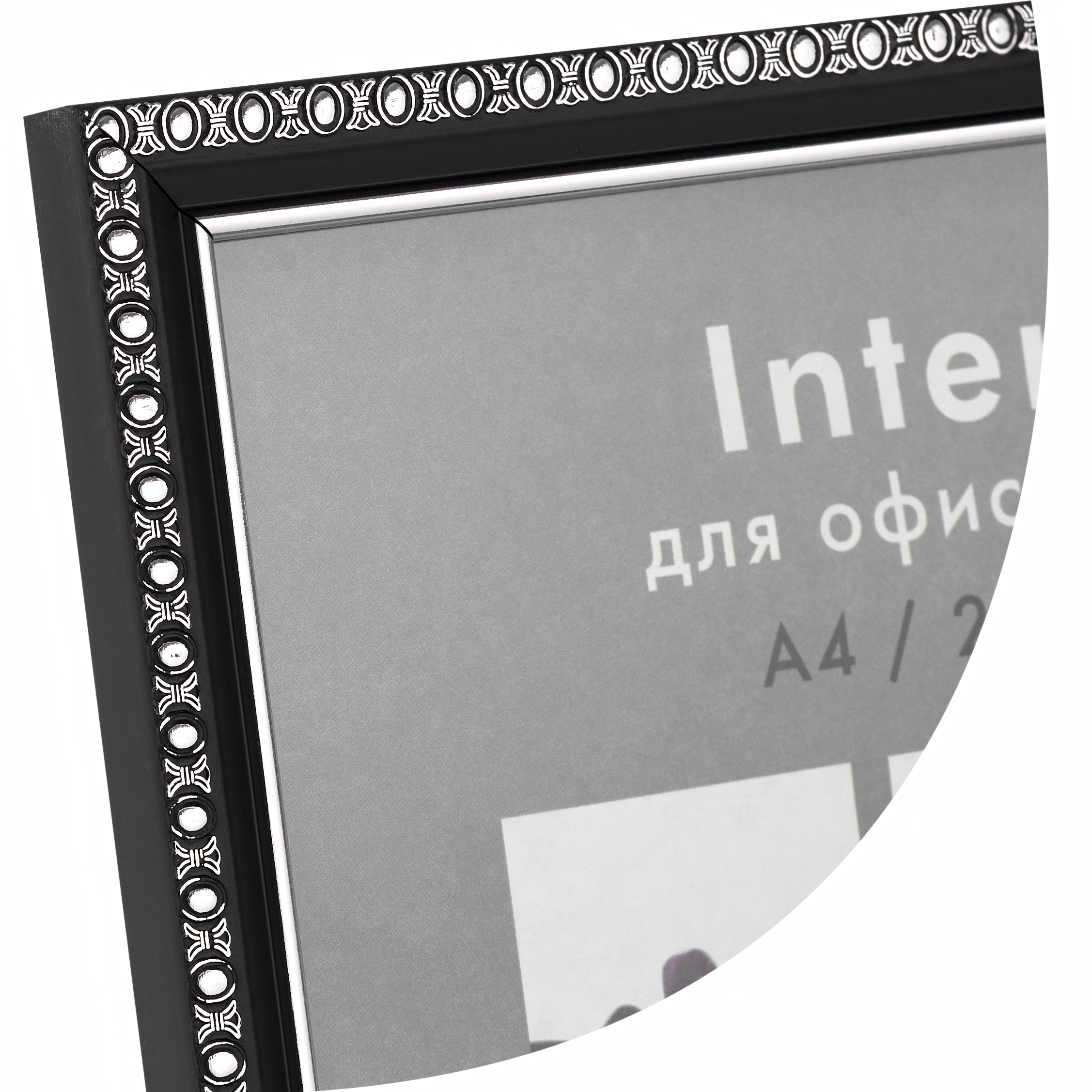 Черная рамка 21x30 (A4) из полукруглого багета шириной 15 мм с декоративными серебряными окантовками по внешнему и внутреннему периметру.