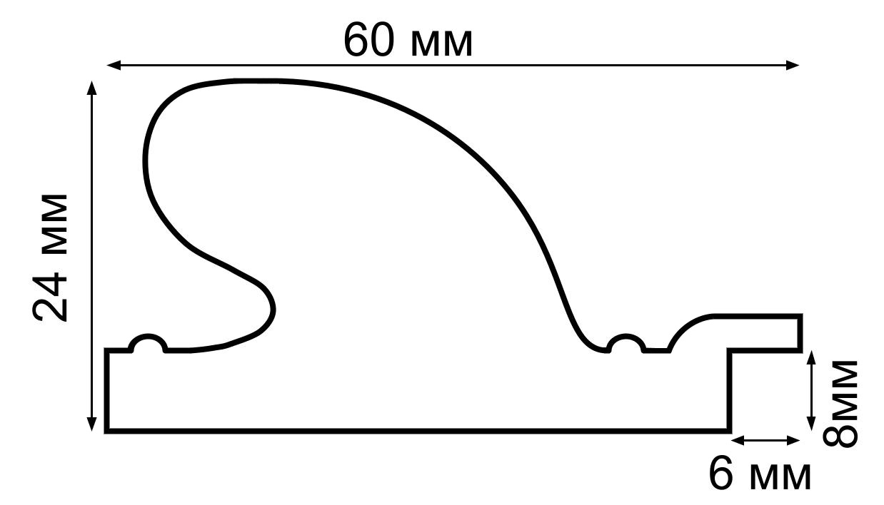 Толщина профиля 24 мм, ширина 60 мм. Толщина задника 2 мм, защитной вставки их пластика ПЭТ 0,5 мм.