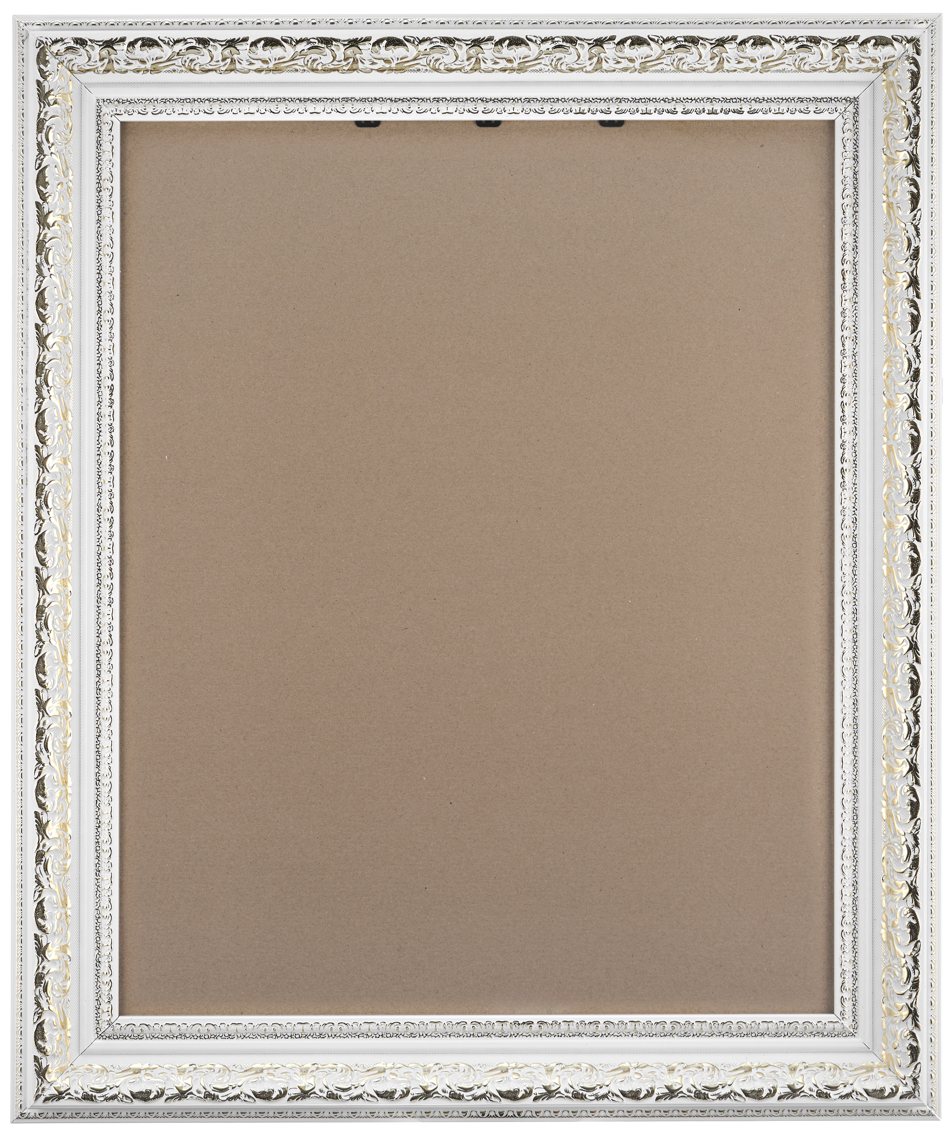 Белая рамка 40x50 из округлого багета формы волны шириной 60 мм с широкой золотой вязью и золотым кантом по внутреннему и внешнему периметру.