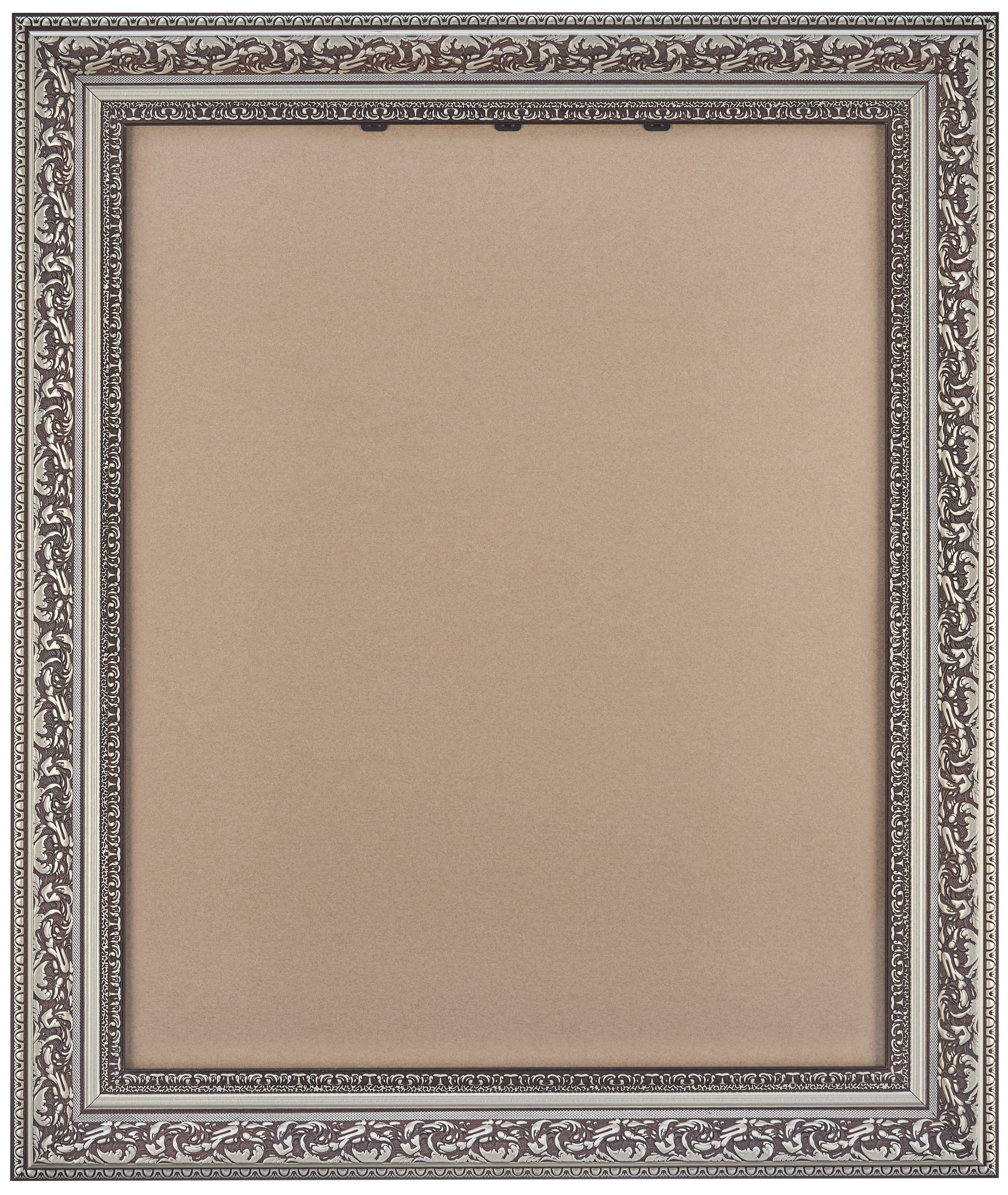 Черная рамка 40x50 из округлого багета формы волны шириной 60 мм с широкой серебряной вязью и серебряным кантом по внутреннему и внешнему периметру.