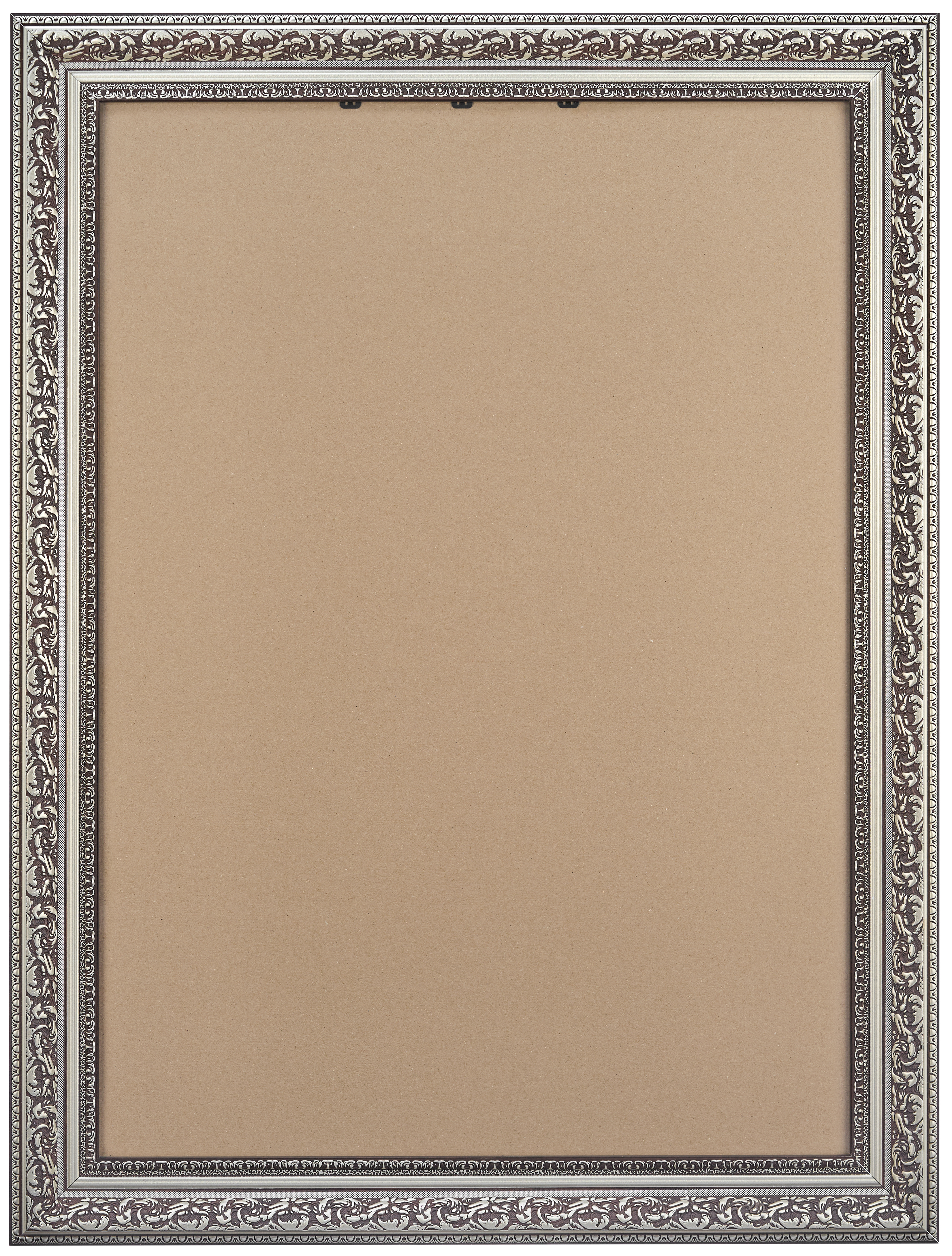 Черная рамка 50x70 из округлого багета формы волны шириной 60 мм с широкой серебряной вязью и серебряным кантом по внутреннему и внешнему периметру.