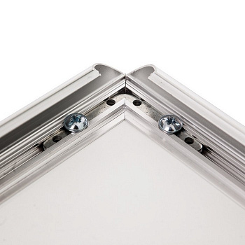 В алюминиевых рамах в качестве защитной вставки используется прозрачный пластик ПЭТ, а не минеральное стекло. Рамка получается легкой и безопасной - её невозможно разбить даже намеренно.
