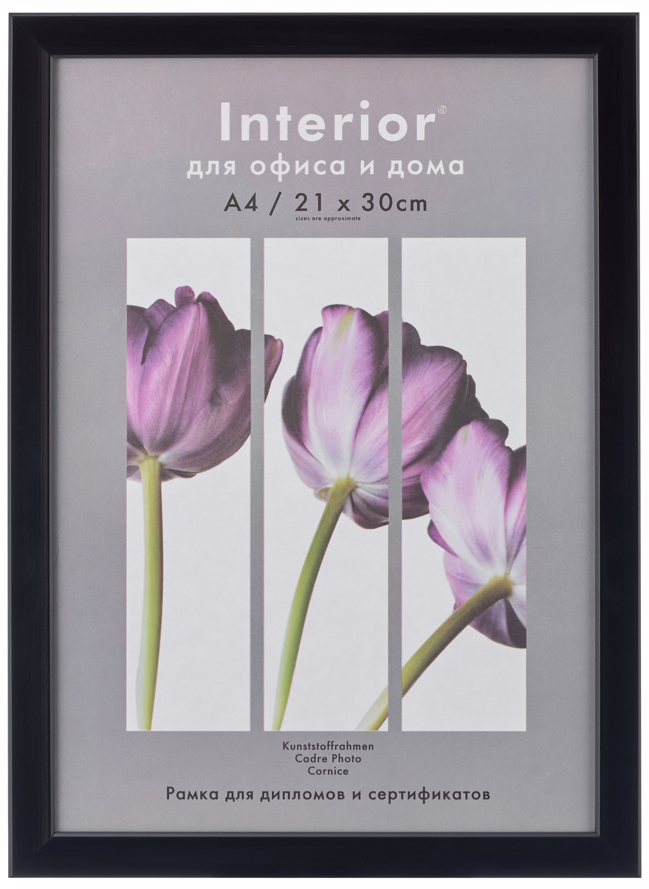 Рамка изготовлена из качественного пластикового профиля, задника из переплетного картона и защитной вставки из пластика ПЭТ.