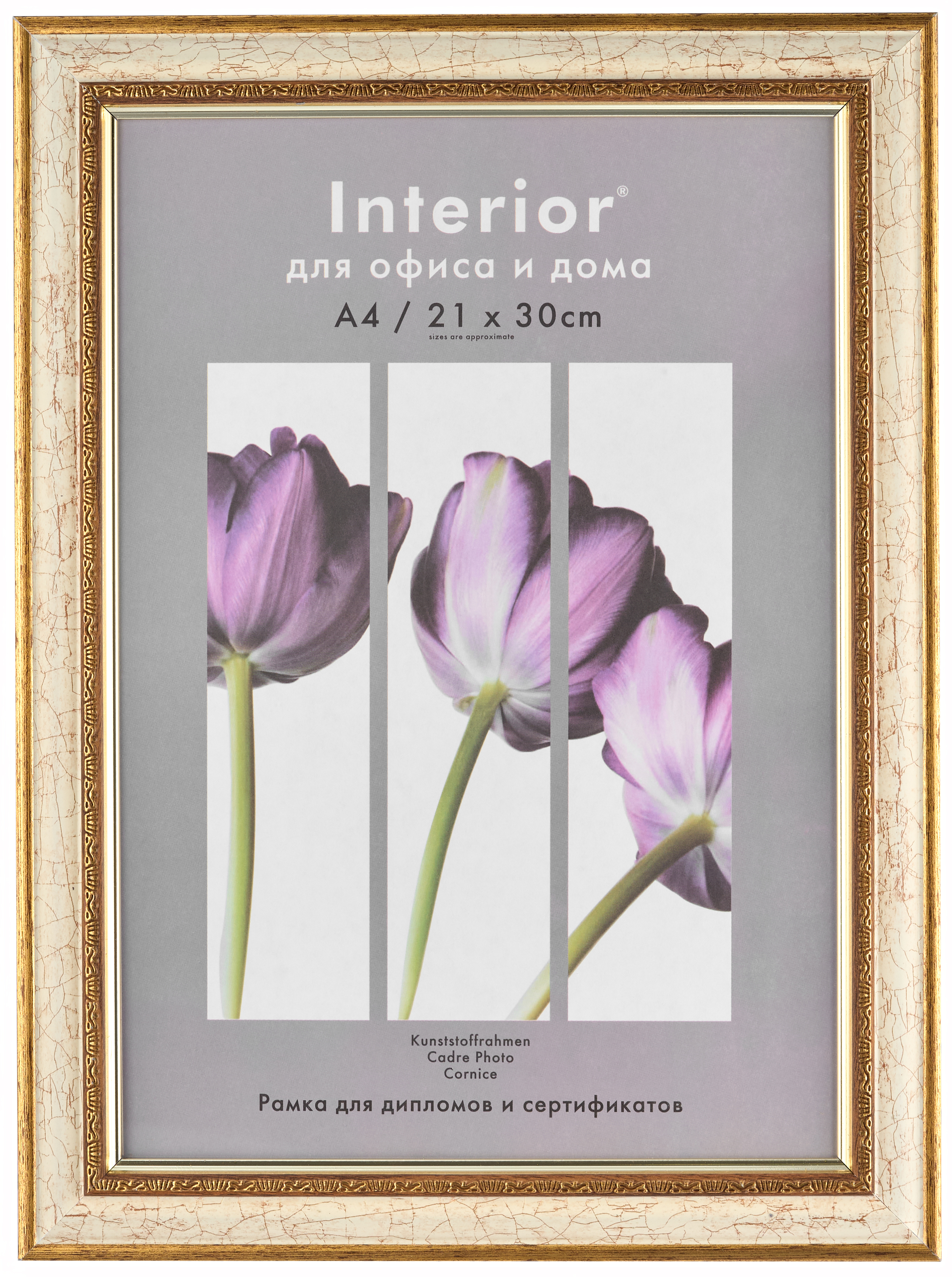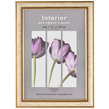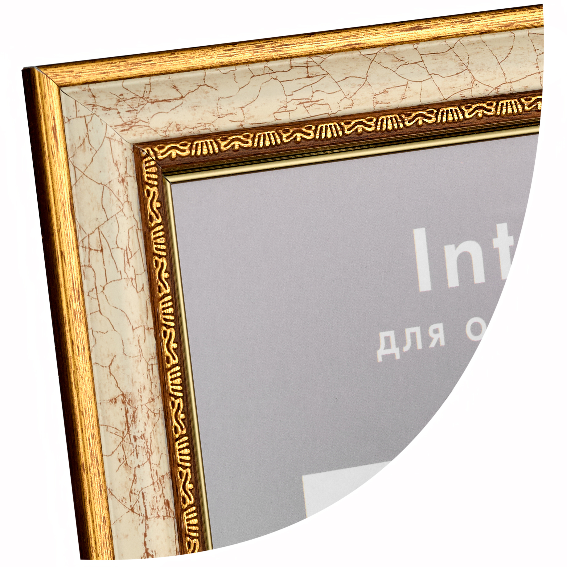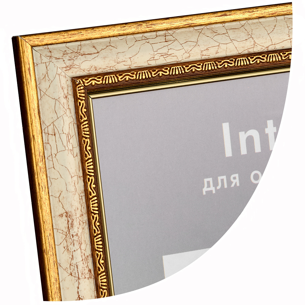 Бежевая рамка 21x30 (A4) из полукруглого багета шириной 29 мм с золотой вязью и золотым кантом по внешнему и внутренниму периметру.