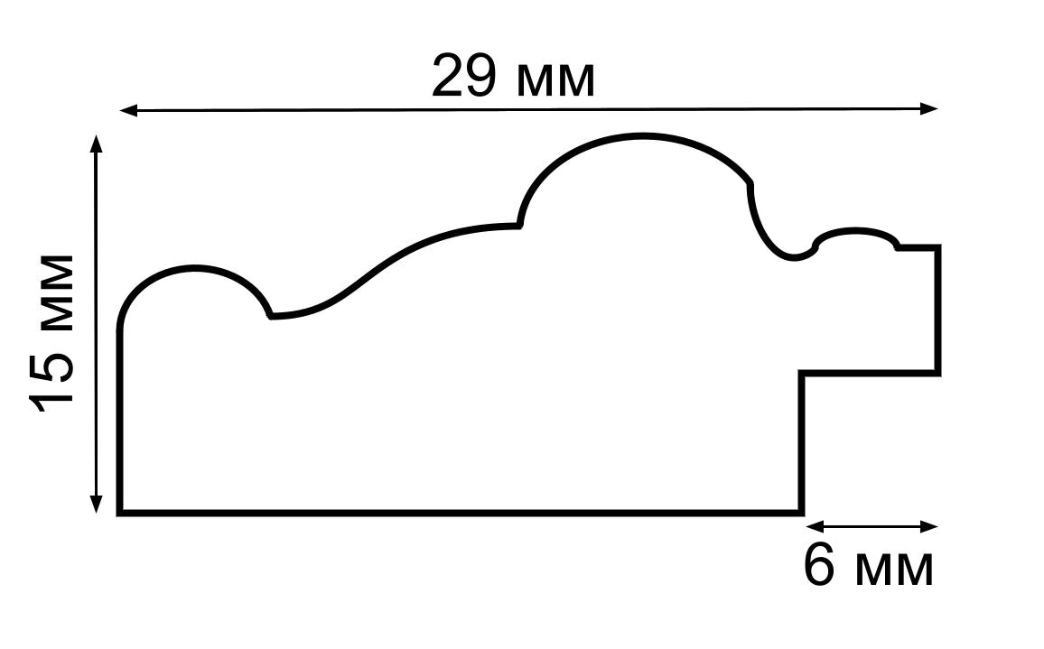 Толщина профиля 15 мм, ширина 29 мм. Толщина задника 2 мм, защитной вставки их пластика ПЭТ 0,5 мм.
