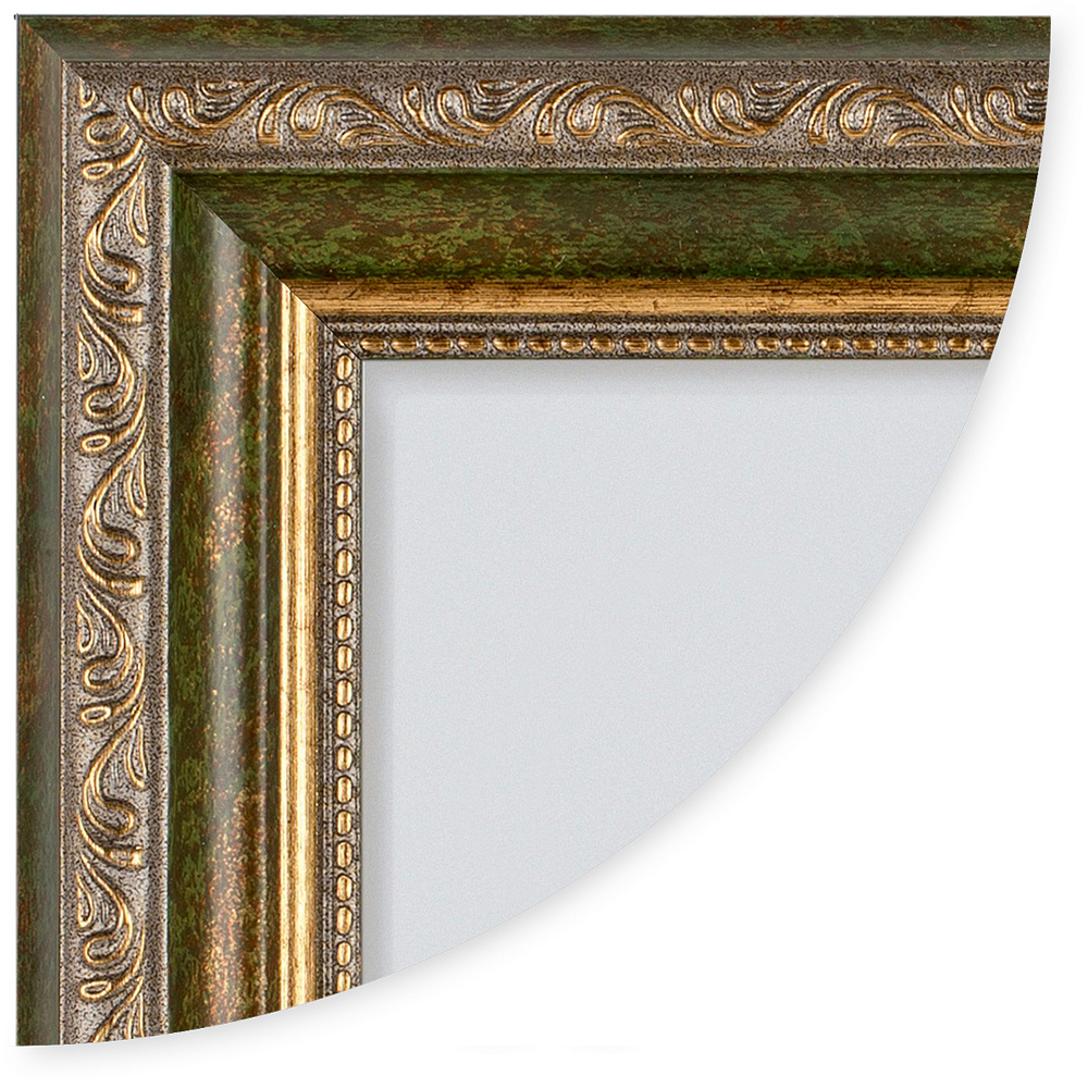 Зеленая рамка 18x24 из фигурного пластикового багета шириной 32мм с декоративными окантовками по периметру.