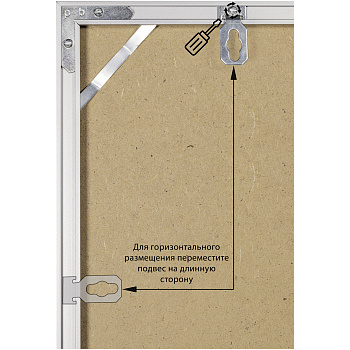 Чтобы вставить изображение в раму, одну из сторон рам необходимо разобрать с помощью шлицевой (плоской) отвертки, а затем разместить металлические подвесные петельки на горизонтальной или вертикальной стороне профиля. Рамы размера 30х40 см (А3) и выше укомплектованы двумя подвесными петельками.