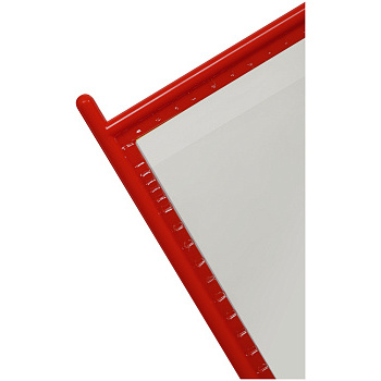 Рамки с штырьками для фиксации в креплении перекидной системы изготовлены из жесткого красного пластика. Пластиковый карман для вложений имеет антибликовую поверхность, что позволяет четко видеть информацию с разных углов обзора.